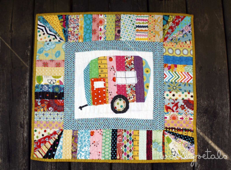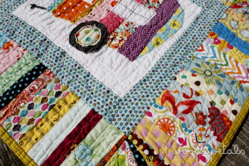 This part, the camper with the white background and polka dot border sat around in my sewing space for awhile. I couldn't figure out the perfect border to make it bigger. Then it hit me a fun striped patchy border. So I grabbed lots of bright prints, cut a bunch of strips, and sew the border up. I kind of did a fun strayed affect on the corners. Don't have a close up of that though.