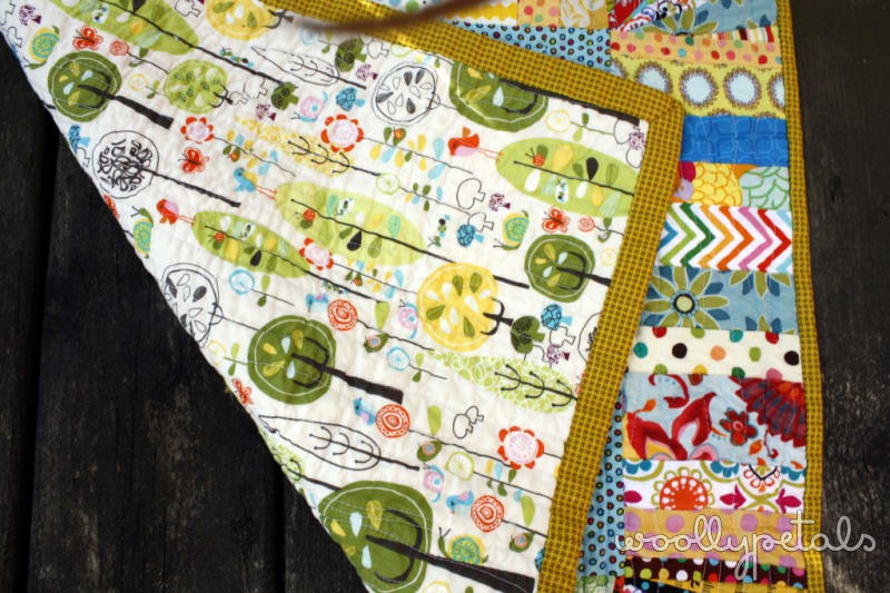 I put a simple woodsy print on the back, from the Happier Collection by Deena Rutter for Riley Blake. It is bound in a lovely mustard mini houndstooth, Denyse Schmidt for Joanns line. It got all soft and crinkly in the wash. Love it.