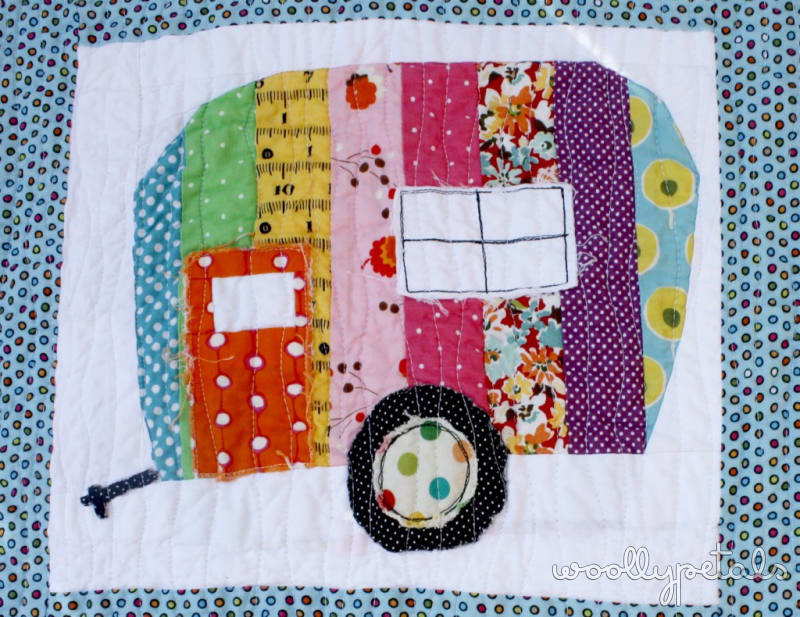 I saw a this Mini Boden shirt and thought, wow, that would make such a cute quilt. :) So I sketched out a similar camper and paper pieced the body. I top stitched all the details on, i.e. the window, door, tire, and hitch. I'm not that good at paper piecing so I went with the top stitch look.