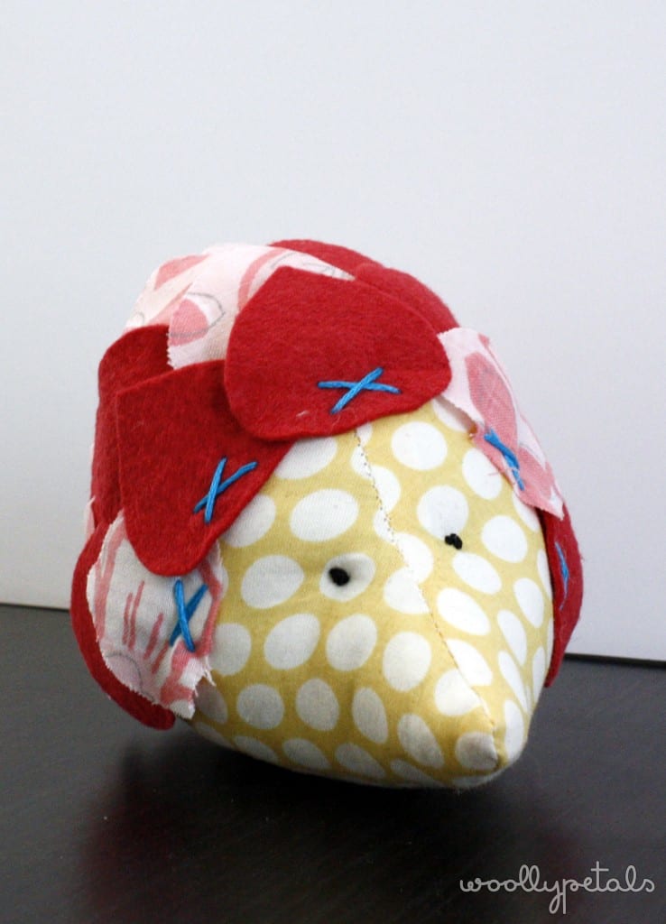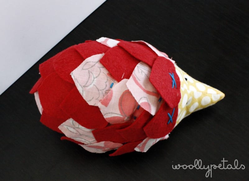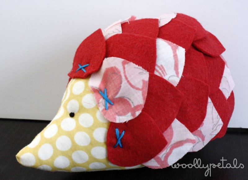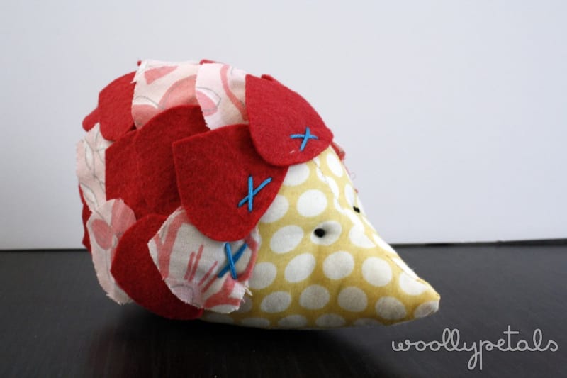 This little hedgehog was made as a gift for a just turned one year old girl. It is a smaller toy and seems the perfect size for one year old hands to hold onto. The Tutorial called for using a sizzix to cut out the spikes if you have a sizzix. I don't so I cut out a leafy shape and then used that as a pattern to cut out a bunch from fabric and the rest of felt. I think I used somewhere around 30 spikes, but looking at the tutorial my spikes are a bit bigger. I also stitched my front spikes with a fun x in aqua, and used the same thread to tack down the rest. I like that bit of contrast the aqua thread gives it.