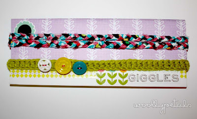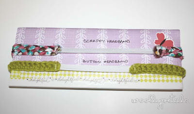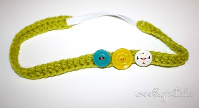 For the 1st one I crocheted a row of double crochet for about 14″ and then sewed on a 3″-4″ piece of elastic to connect the ends. I then added some cute vintage buttons in bright colors.