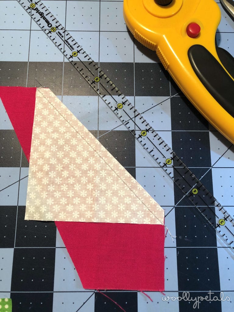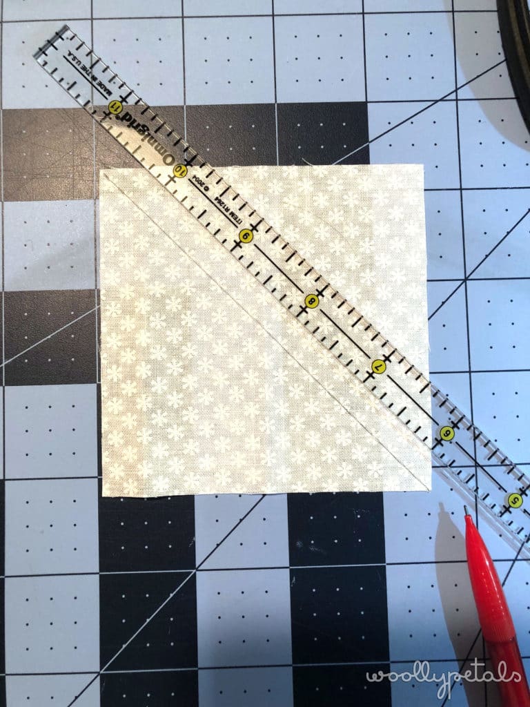Second, I grab all my half square triangle pieces, or HST's for short, and bring them to the side and mark the diagonal line on the backs of all of them. This way I can piece them all at once with my regular presser foot and then switch to my 1/4″ presser foot when I am piecing the blocks. So the pattern tells you to do the HST's along the way. Which is a great way to do it for your first shot if your not used to patterns like this. Once you have one under your belt, sewing them all at the beginning is really a time saver.