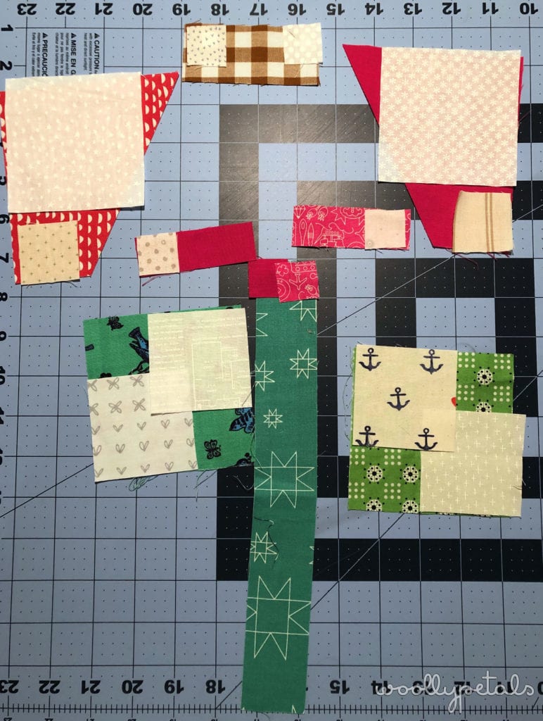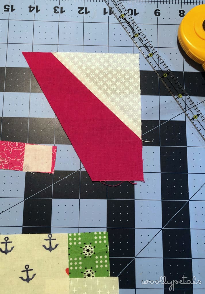 Third, after I have done all the HST's I lay them in their spots among all the pieces I have laid out for the block. Then I follow along with the pattern and 1/4″ piece all the pieces together for the final product. TA-DA!