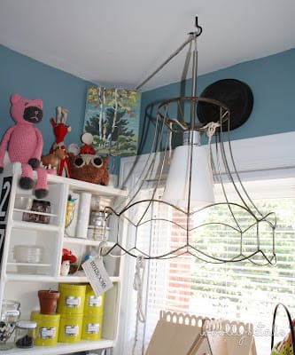 This lovely lampshade is one I found while garage saling several weeks ago. I recently was able to pick up the lamp parts and concoct this. So far I am liking it. Eventually the plan is to put in a little girls room with some girly items attached but for now I will satisfy the girl nursery desires by having it in my sewing room as there are no babies on the horizon yet.