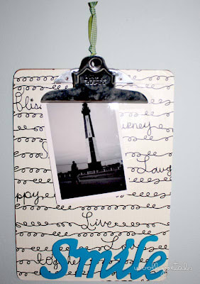 I decoupaged this clipboard and added a painted wood inspiration word. I like to think it will be used to hold pictures and inspiration that make a smile.