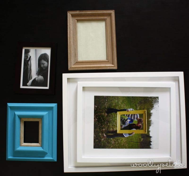 I had all the frames as seen in the before picture. But I have been looking at thrift stores and found the three washed wood, and then painted a third teal one. I just put pictures in the frames based on size of picture matched to frame size, but not there orientation on the wall.