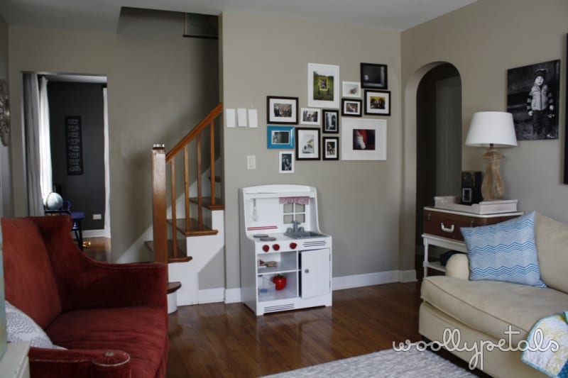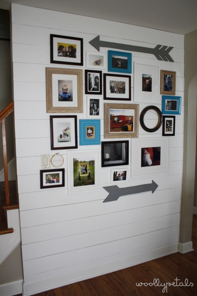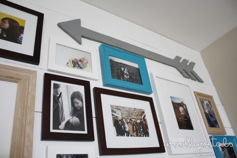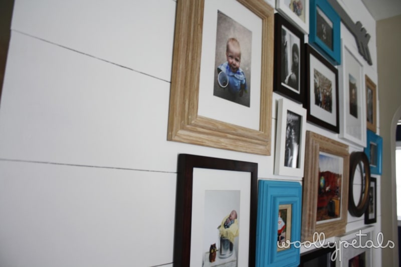 Okay let's start at the beginning. My old wall, missing a couple pictures. I knew I wanted a change, not to mention we needed to add new pictures of Luke and other family. I had been tossing around the idea of a white plank wall for awhile but thought it would be to expensive, and typical pine wood planks are almost an 1″ thick which I didn't like. But once I saw Sausha's post I set out to tackle this wall.