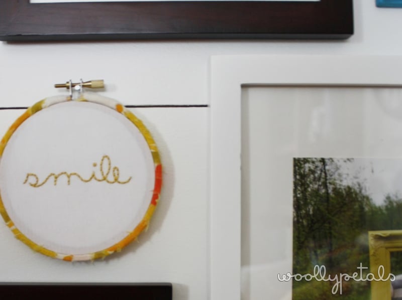 I stitched up this little smile embroidery and covered the hoop with vintage fabric, to add a little whimsy to the wall.
