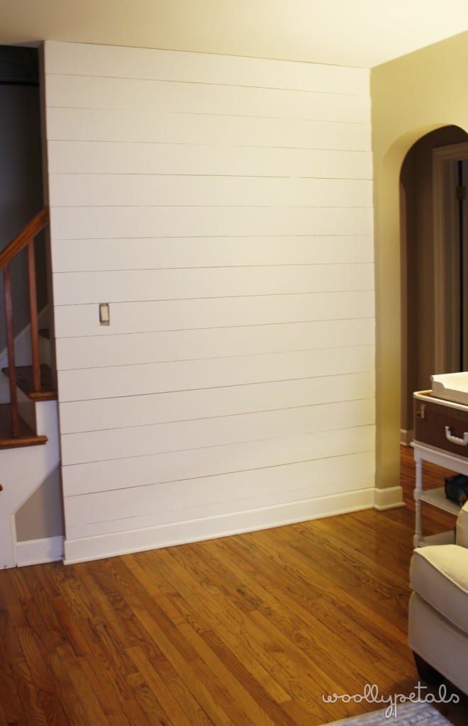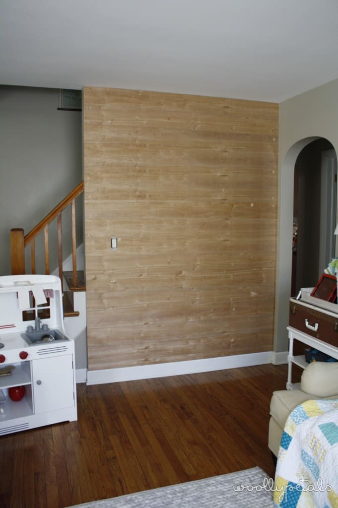 A few in process pictures. I had a helper picking up my wood. I had Home Depot cut my 8′ x 4′ strips into 2′ x 8′ strips. My husband and I then use a table saw to slice them down to just under 6″. They are by no means perfect, but I think that you probably can't tell and if so it adds to the charm. Then I just attached them to the wall with my non compressor battery operated nail gun. I admittedly had to use a hammer to help some of the nail gun nails in.