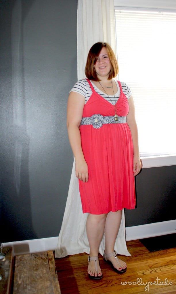 So I tried to dress out of my comfort zone with some fashion trends?!?. Wearing a T-shirt under a spaghetti strap dress, and wearing patterns together. I have always liked the look of the shirt with a strappy dress or tank over but never could find the right combo until I decided stripes underneath could look cute? right? Then I grab this belt I whipped up the other night planning to wear it with a different shirt, but didn't, and thought what the heck. So there you have it. I felt cute yet slightly uncomfortable.