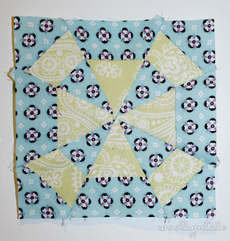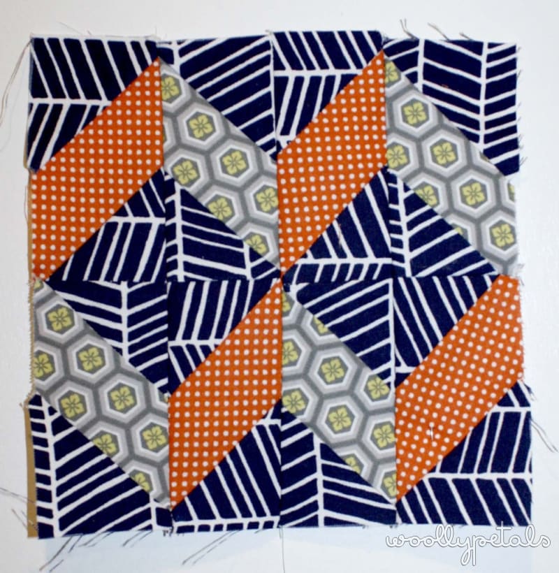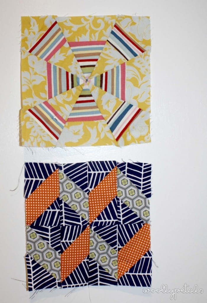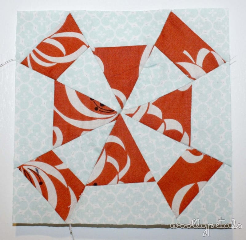 Loving the fabrics, not loving the wonkiness that I just couldn't straighten it out. The points don't match and the two trianglular pieces where both off when I went to sew them together and I couldn't get them square no matter the amount of trimming. Which landed this one in the discard pile at a finished size 1/4″ smaller than it should be.