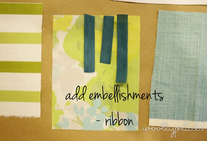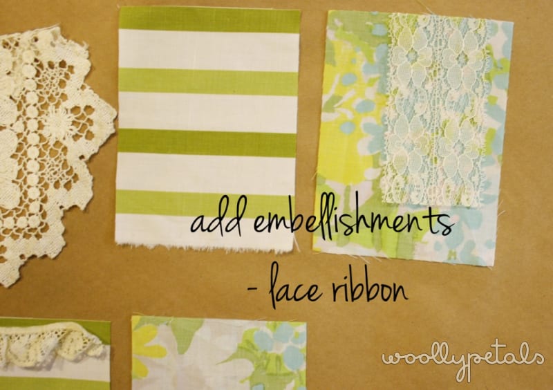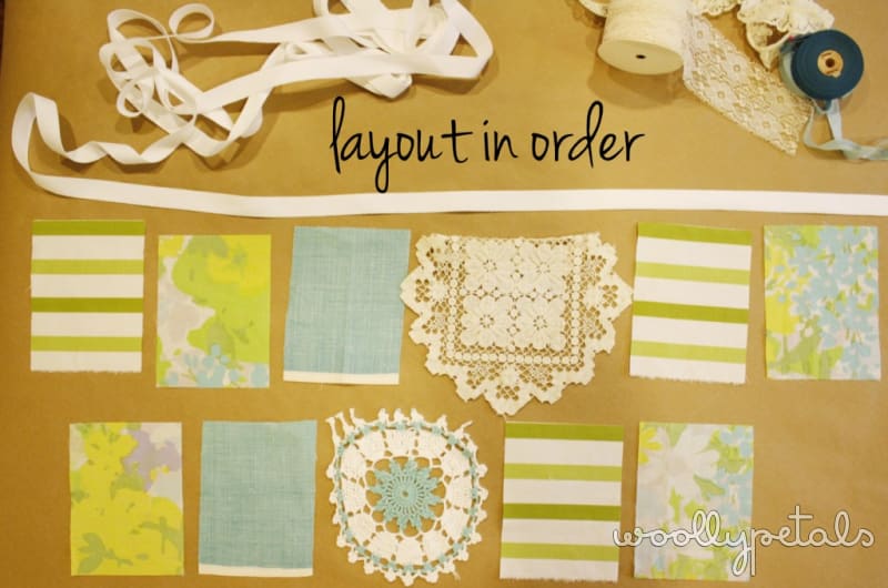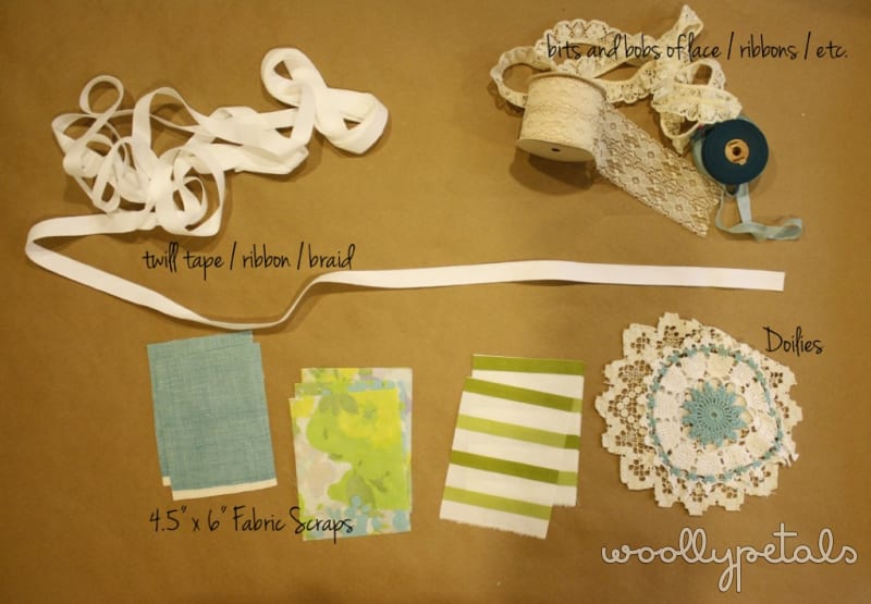 You will need some twill tape, ribbon, braid, or rope. Some fabric scraps cut at 4.5″ wide x 6″, some fun doilies or embroidered fabric. You can also add some fun embellishments, ribbon, lace, mini doilies, etc. You will also need, a sewing machine, or needle and thread to sew by hand, or a glue gun. This can be a no sew project if you like. I also used a ruler, straight pins, and scissors.