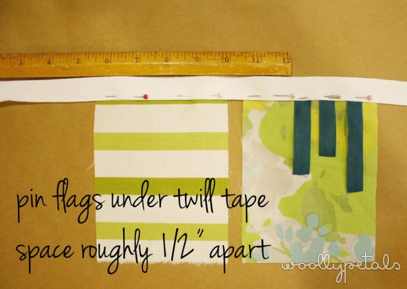 I did pin my pendants/flags to the twill, about 1/2″ under the twill, and about 1/2″ apart.