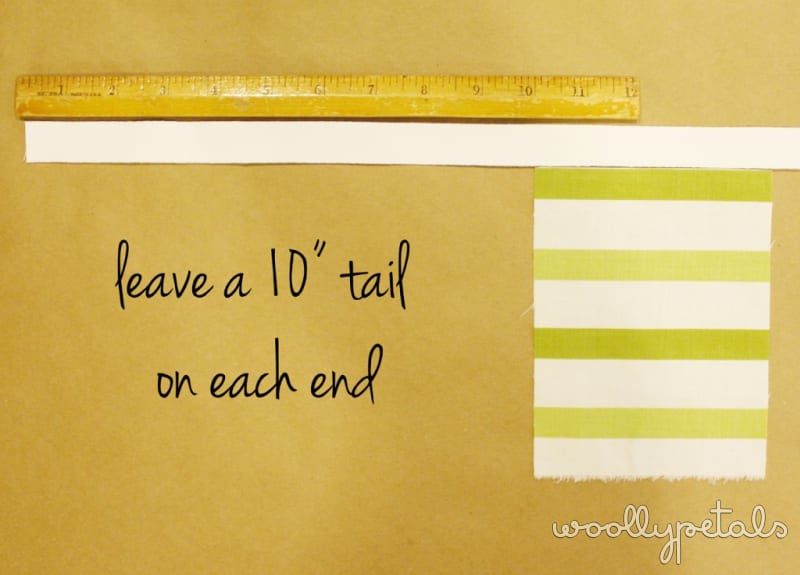 To sew on I leave a 10″ tail on either end to hang the garland from. You can tie it to something or pin or tape it up.