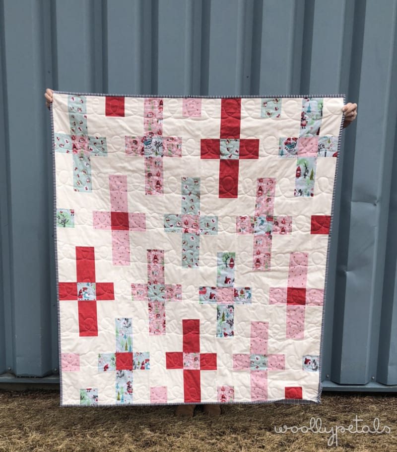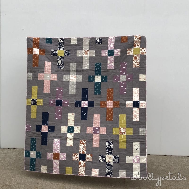 This little baby quilt is smaller than the pattern but you could whip it up from the pattern information easily. I went with the option to make each plus from a separate fabric for this and love the scrappy feel to it.