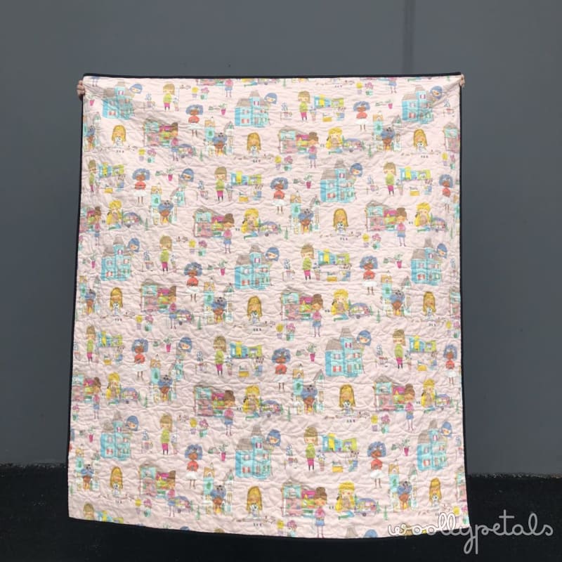 This quilt is made with Tula Pink Freespirit Solids in Taffy, Hibiscus, Tula, Mojito, Aegean, Cerulean, and Iris. The background is Cotton and Steel XOXO basic in Chocolate Chip. Oh and isn't this backing just about the cutest thing ever? It is all sorts of dollhouses and little girls playing and crafting. Big massive love for it! P.S. it's called Welcome to my Dollhouse and is an Alexander Henry Print.
