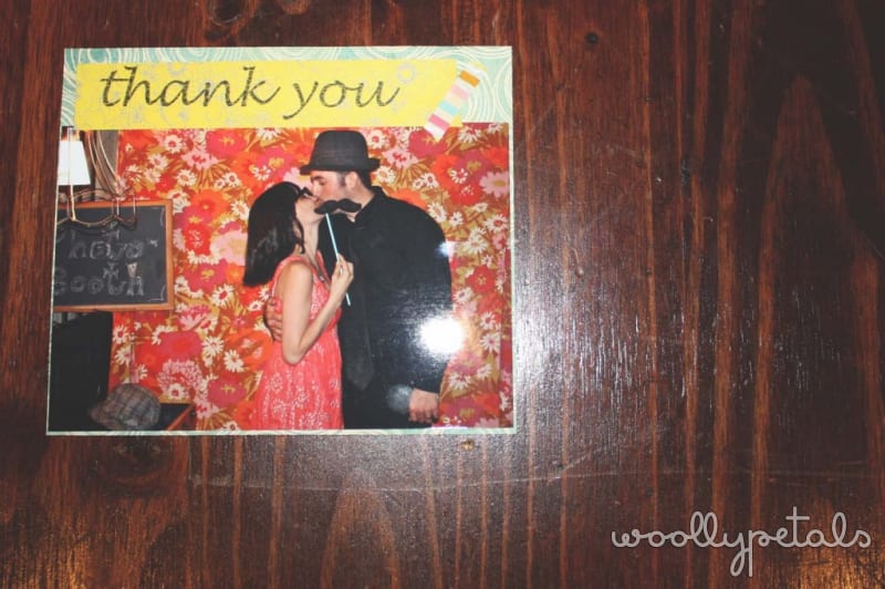 I then cut scrapbook paper to about 6″ x 5.25″ to fit in the envelopes I had. I taped the photo to the paper, this way they can take the photo off and frame it or hang it up on their refridgorater if they want. I then printed several lines of Thank You on scrapbook paper cut to fit in my printer. I tore along one edge of the thank you paper, and then cut out the rest in strips. I taped the thank you strips overlapping the pictures slightly, and added a decorative masking tape embellishment. Simple, yet fun, and something they can keep as a memory. I wrote the actual thank you notes on the back.