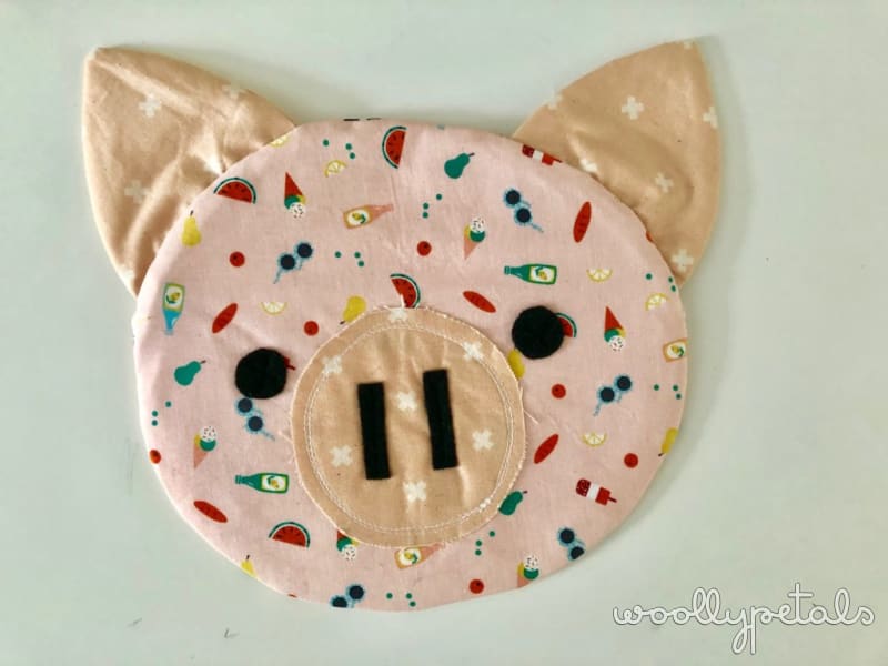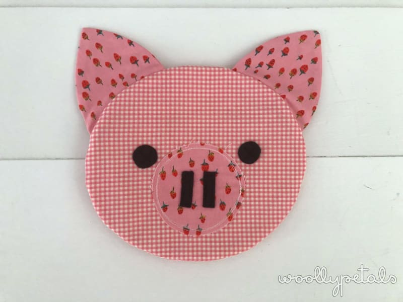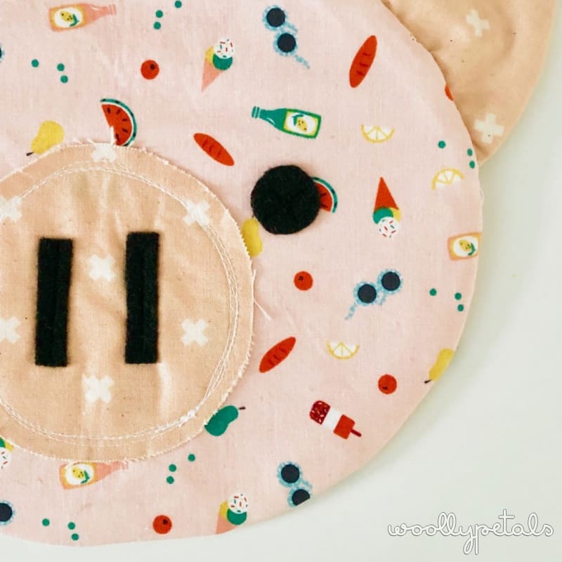 The ears are sewn into the seam and are a bit floppy so they add a fun texture that way. The snout, nose, and eyes are all appliqued on and you can play with the placement to add personality. There is also the option of adding a little curly tail to the back. Squeal!