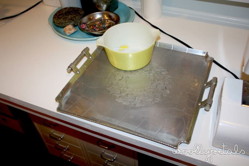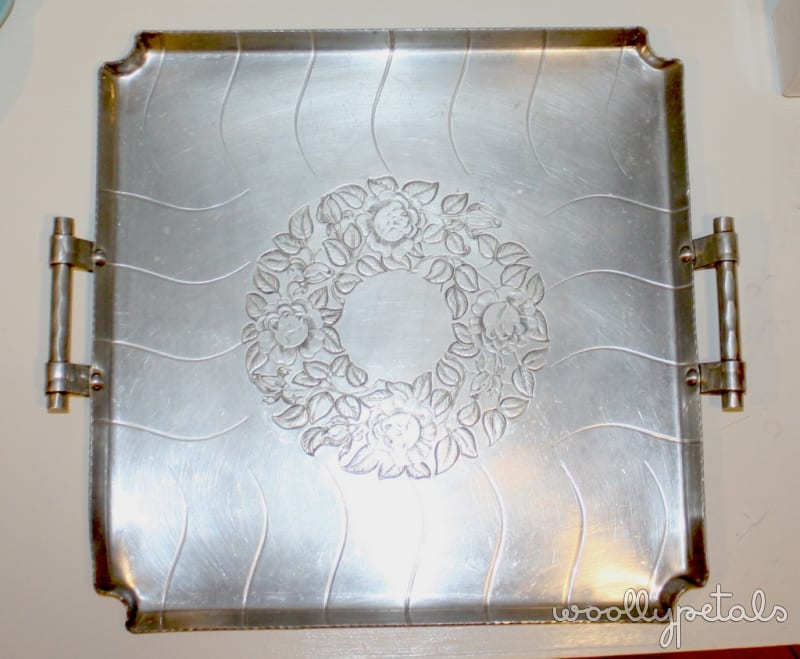 I also found this beautiful tray at the Goodwill. I have a small love affair with silver trays and platters which you may know if you have seen my kitchen walls. I saw this one and had to grab it. I am using it next to my sewing machine to hold my current project.