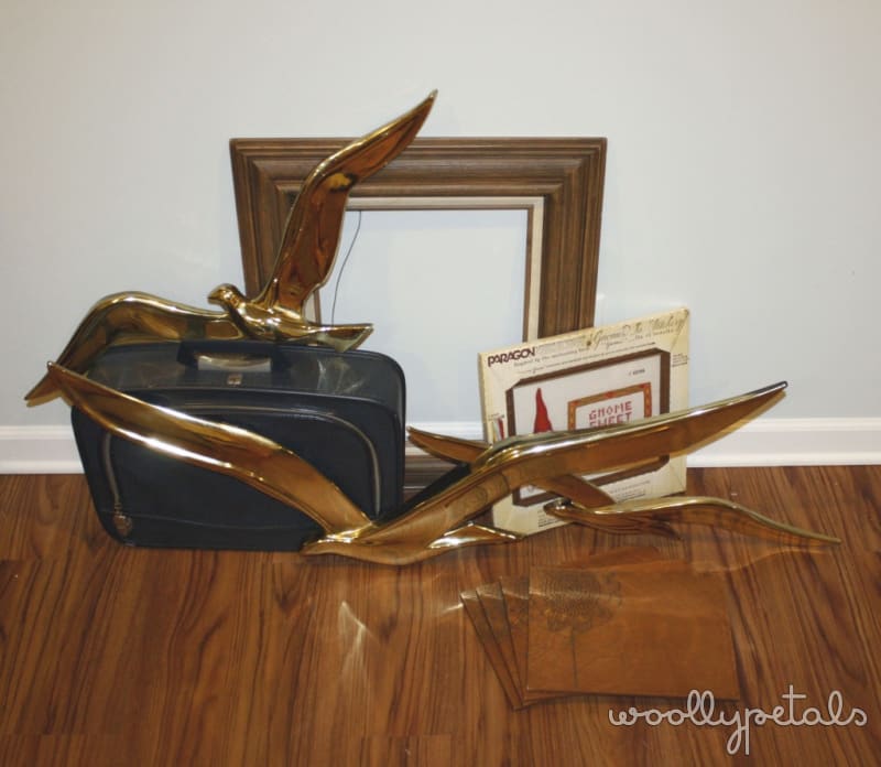 Some of my finds included a wood picture, a mini navy blue suitcase, two bird wall art scupltures to be painted, a gnome embroidery kit, 4 wood engraved placemats?, and a couple clothing items (not pictured).