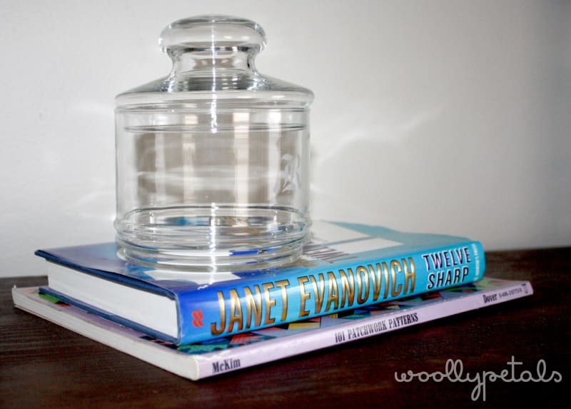 I came home with a few small items that I just couldn't pass up. A super cute silky sheath blouse in lovely greens. I am sure you will be seeing it in a WWIW post in the future. I also found this lovely glass jar with a lid and a R etched in the side. It is going in our upstairs bath to hold q-tips since our current jar has no lid. I also picked up a couple books. I am trying to finish collecting the Stephanie Plum series by Janet Evanovich in hardcover, so I added Twelve Sharp today for a mere $1.5o. I also found this lovely 1960's patchwork pattern book. I am loving all the patchwork blocks it shows and has patterns for.