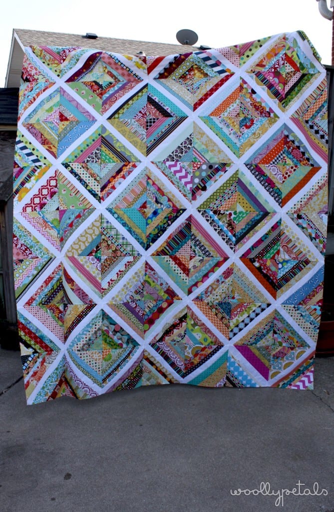 This is my long awaited string top. I have wanted to make this quilt ever since I saw Ashley of Film in the Fridges string quilts, she has a great string block tutorial if your interested. I have been saving scrap strips forever and finally got around to making one this spring. The above picture is in the shade so it's a little dark. I just LOVE this quilt and I cannot wait to quilt it.