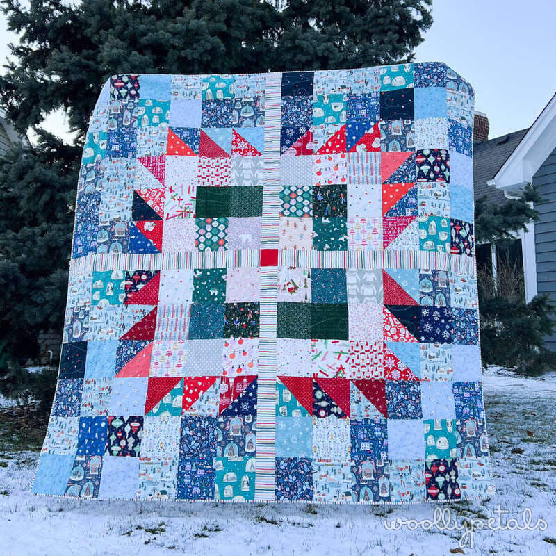 In December of 2021 I decided to make a Christmas version and made it bigger adding an extra border and switching the background to patchwork as well. I added a page to the pattern then to share how to sew this version up.