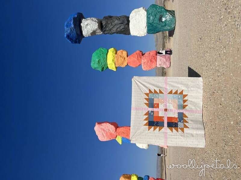 In spring of 2022 I made a version using a Charm Pack, 5″ squares that finish at 4.5″. I increased the background sizes to make the quilt a 60″ square and a decent size. I am finally getting around to adding that version to the pattern.
