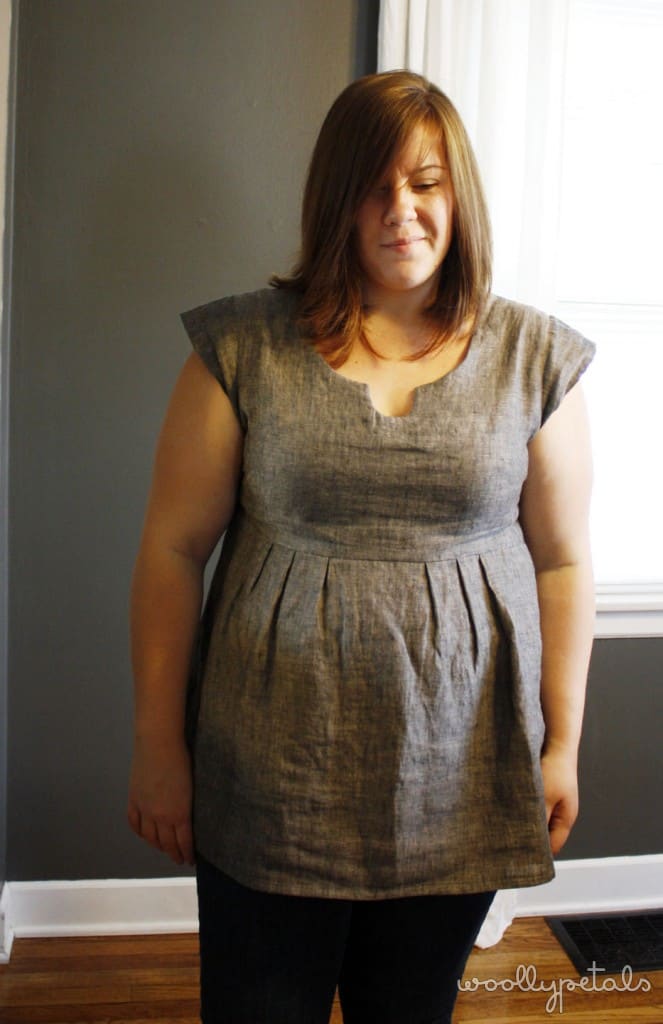 This is a lovely pattern, super simple and makes a nice fitting comfy tunic. I went with the tunic length for my Washi as I love longer shirts and this fits the bill perfectly. I watched the tutorial video on how to fully line the top section and went with that method above facings. I also made a muslin twice, the first time was exact pattern measurements, and the second was with the adjustments to make it fit like a glove. I HIGHLY recommend the muslin, it fit from just going with the pattern but I wouldn't have been as happy with it without the adjustments. I also didn't have an elastic thread and David was gone while the baby slept so I sewed in thin elastic on the same lines it marks for the elastic thread. I would like to try the thread on my next one, but the elastic works great to. All in all I love it, I used a soft linen material that is a couple shades of gray and the fabric is nice and soft albeit wrinkles a bit. :) Go make yourself one, You won't regret it.