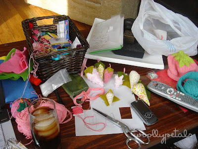Today after a lists of errands got done this morning. I positioned myself in front of the tv to work on some projects. Below is the view of my work area.